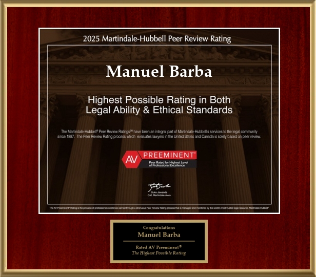 Attorney Barba has also been awarded the AV® Preeminent™ rating from Martindale-Hubbell®. This rating represents the pinnacle of professional excellence and is achieved only after recommendation by their peers – members of the bar and the judiciary.