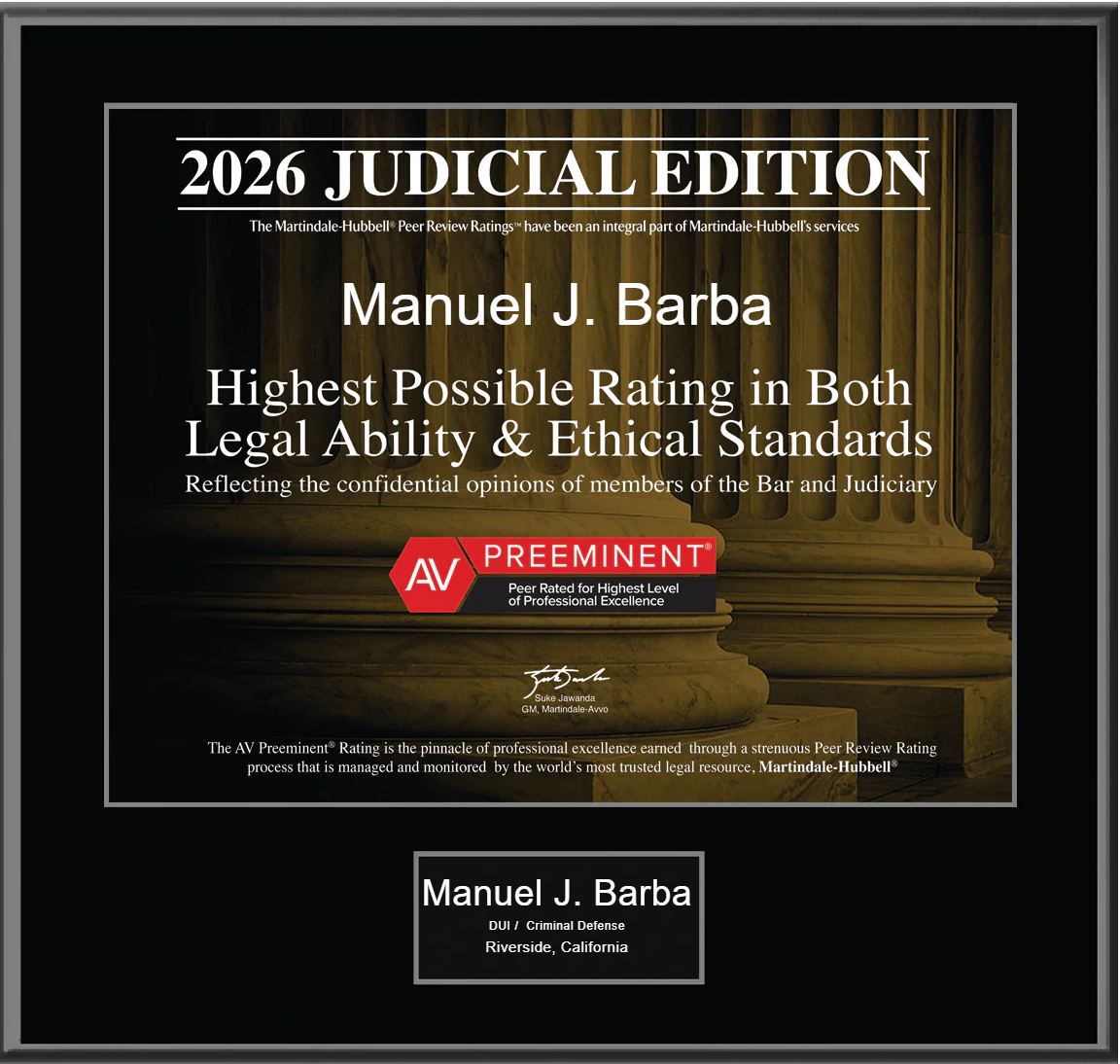 Attorney Manuel J. Barba only does one thing. He provides professional & experienced DUI Defense in the California Criminal Courts and the DMV. Southern California DUI Defense Attorney Manuel J. Barba is an expert in DUI Defense and has dedicated his law practice to defending people accused of DUI for alcohol and/or drugs, as well as other driving related cases.